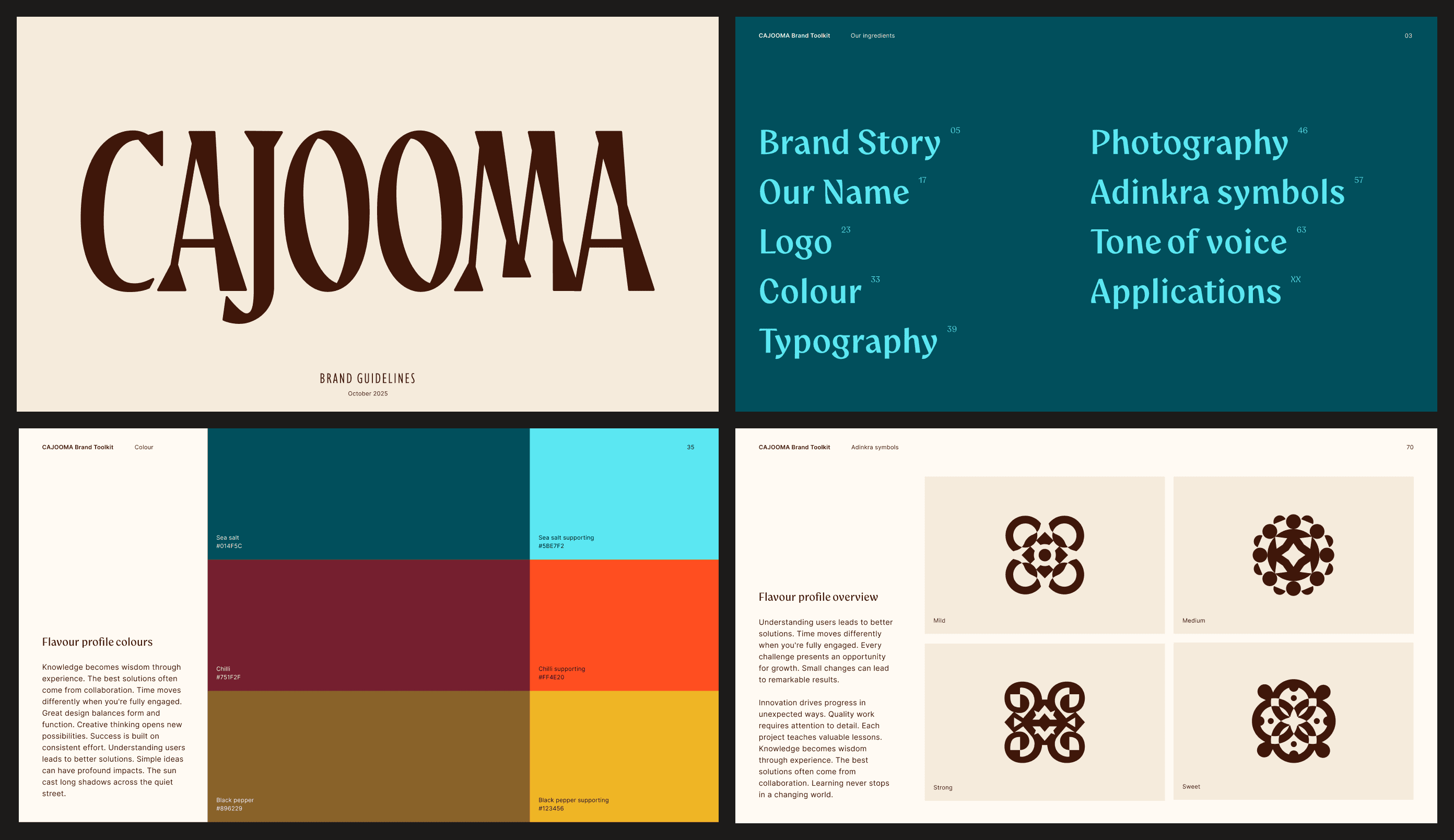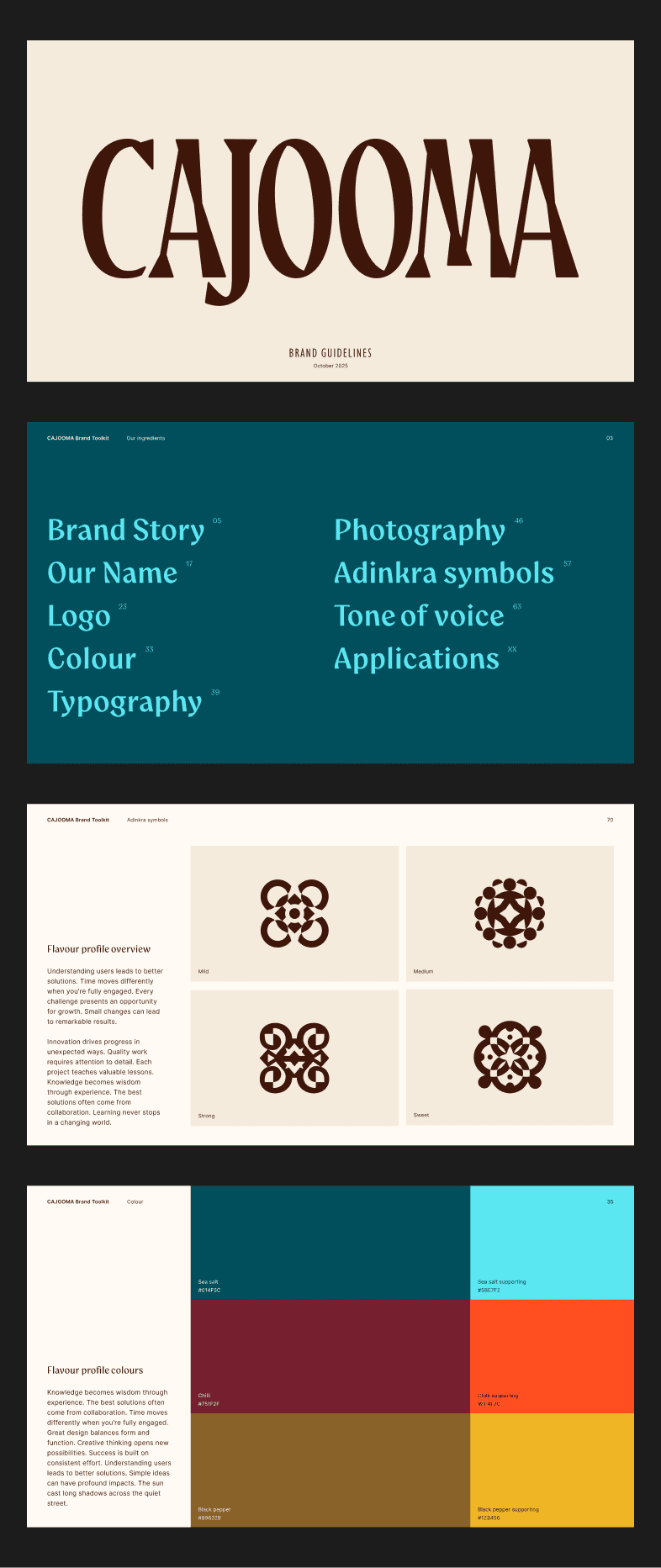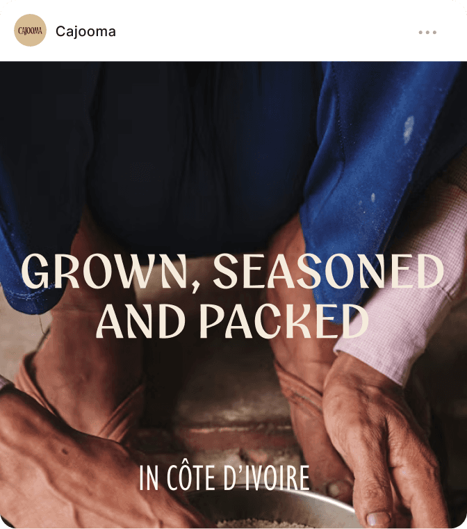Cajooma is a challenger cashew brand that grows, processes, and packs everything locally in Côte d'Ivoire instead of shipping raw nuts overseas. They had strong packaging and a clear story, but the rest hadn't been built yet. The challenge was creating guidelines that were both aspirational and genuinely useful for a brand that hadn't launched yet. Turning packaging components into a functioning system meant defining spacing, color applications, typographic rules, and usage guidelines across every context the brand would need. But documentation alone wouldn't cut it. The system had to prove itself through real applications to see where it flexed naturally and where it needed structure. Building the system by using it, so the guidelines would hold up when the brand went live